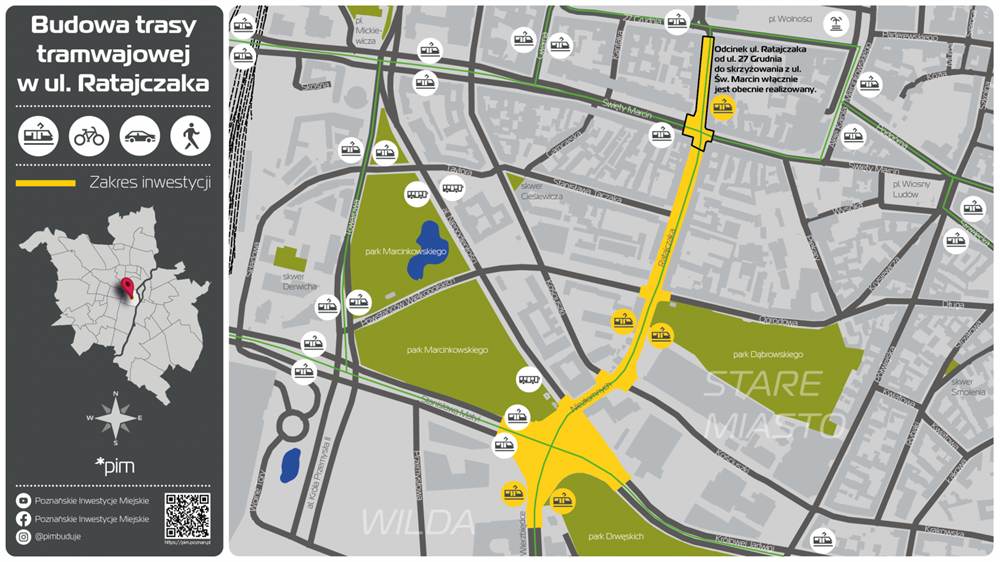 oczywiście o trasą na Ratajczaka, tym razem na odcinku od Święty Marcin do ulicy Wierzbięcie. Przypomnijmy, że pierwotnie trasa miała powstać w ramach Projektu Centrum do końca 2023 roku, jednak z powodów finansowych (pandemia, wojna w Ukrainie, inflacja) i