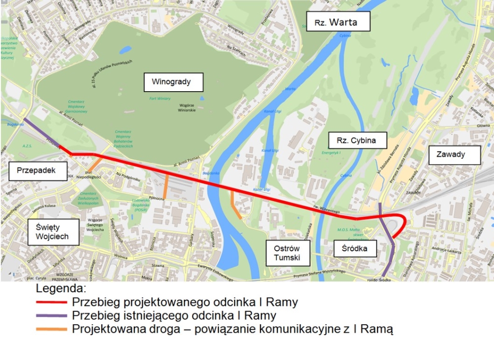 I rama komunikacyjnaKoncepcja budowy północnego odcinka tej trasy obejmuje powstanie drogi łączącej skrzyżowanie ulice Pułaskiego i Przepadek z ul. Podwale. Jej przebieg w zachodniej części pokrywa się z istniejącą ul. Przepadek, a po przekroczeniu linii kolejowej prowadzi wzdłuż terenów kolejowych, po ich południowej stronie. Droga przekroczy Wartę, Kanał Ulgi i Cybinę mostami przerzuconymi "w sąsiedztwie" przepraw kolejowych, a następnie połączy się z ul. Podwale węzłem drogowym, planowanym w rejonie pętli tramwajowej Zawady. W ramach inwestycji miałoby powstać pięć wiaduktów (nad al. Niepodległości, ul. Ku Cytadeli, ul. Garbary, ul. Panny Marii i ul. Podwale), wspomniane trzy mosty oraz estakada dojazdowa do ul. Podwale. Koncepcja uwzględnia plany rozbudowy infrastruktury kolejowej pomiędzy stacjami Poznań Główny – Poznań Wschód, jak również ewentualność budowy linii tramwajowej od pętli Zawady do stacji Poznań Wschód.