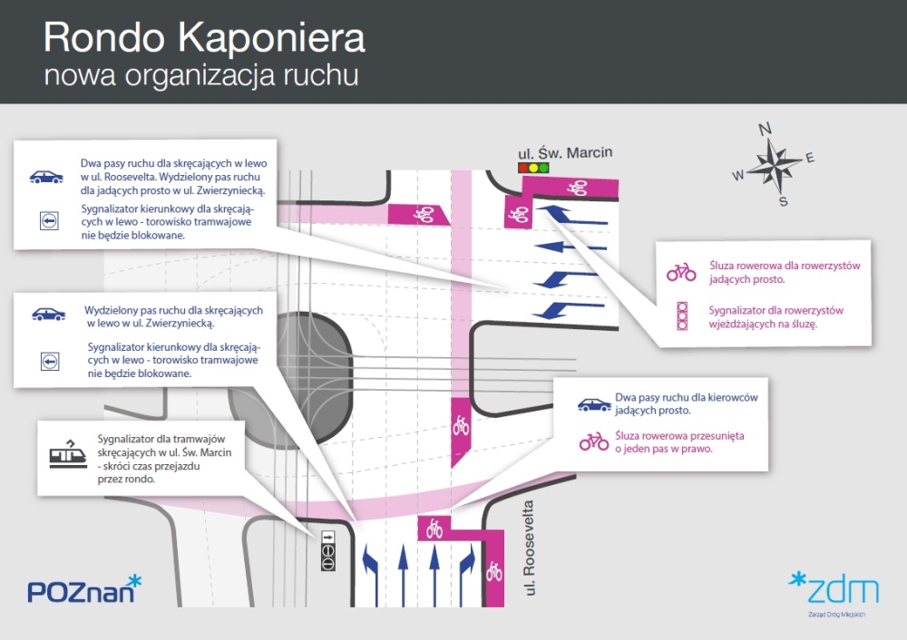 Kolejne etapy, drugi i trzeci, będą wprowadzane już w przyszłym roku, gdy rozpocznie się przebudowa skrzyżowania ul. Św. Marcin z al. Niepodległości oraz budowa dwukierunkowej drogi rowerowej w ul. Zwierzynieckiej. Ostateczna forma zmiany organizacji ruchu na rondzie Kaponiera uzyskana zostanie po zakończeniu obu inwestycji.