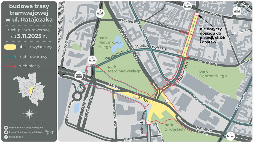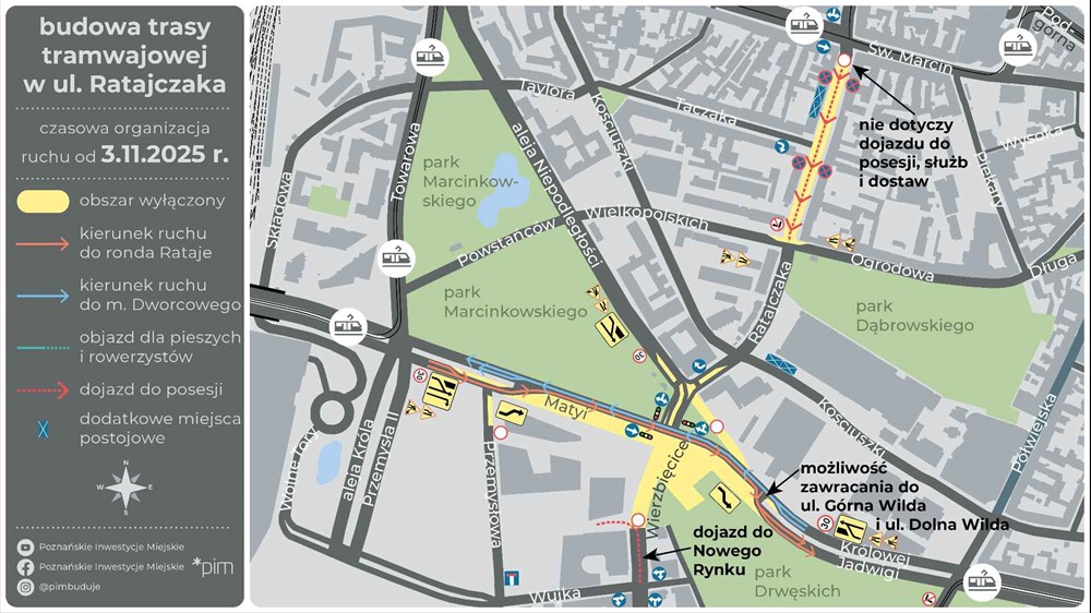 Drugim miejscem, gdzie rozpoczną się prace i wynikające z nich zmiany w organizacji ruchu, jest odcinek ul. Ratajczaka pomiędzy ul. Św. Marcin a Ogrodową. Zostanie on wyłączony z ruchu - zachowany będzie tylko dojazd do posesji i obsługi służb. Również sąsiednia ul. Taczaka udostępniona zostanie jedynie w celu dojazdu do nieruchomości. Na czas prac w ciągu ul. Ogrodowej i ul. Powstańców Wielkopolskich występować będą zawężenia jezdni, ale w czasie trwania robót ulice te będą przejezdne.