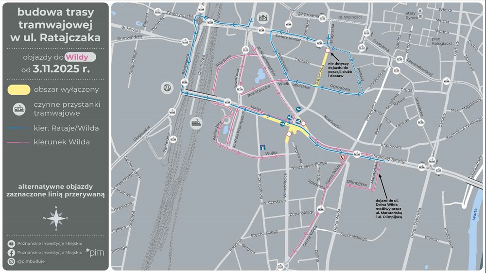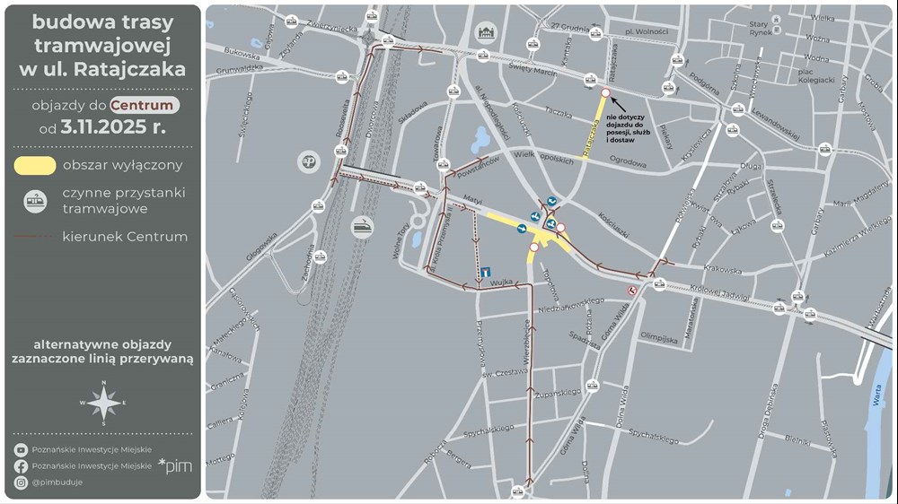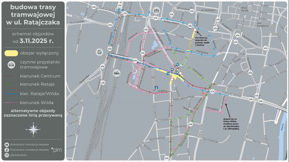 – W ostatnich tygodniach prowadzone były niewidoczne w terenie, ale intensywne przygotowania do inwestycji. Wykonawca koncentrował się na opracowaniu projektu czasowej organizacji ruchu, za nami wiele spotkań i ustaleń w zakresie najbardziej optymalnych rozwiązań. Zależy nam na sprawnym przeprowadzeniu prac budowlanych, by trwały możliwie najkrócej. Roboty równolegle rozpoczną się na węźle Wierzbięcice oraz na odcinku ul. Ratajczaka między Św. Marcinem a ul. Ogrodową. Wyłączenie torowiska na węźle skutkować będzie zmianami tras tramwajów, które z kolei zostaną skoordynowane z pracami na moście Chrobrego, by tymczasowy układ tras był czytelny dla pasażerów – wyjaśnia Tomasz Płóciniczak, wiceprezes spółki Poznańskie Inwestycje Miejskie.