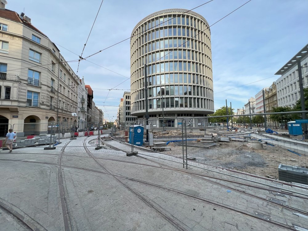 Węzeł rozjazdowy przy Okrąglaku, po prawej stronie widoczne miejsce na brakujący łuk z 27 grudnia w ulicę Mielżyńskiego. Fot. Poznańskie Inwestycje Miejskie