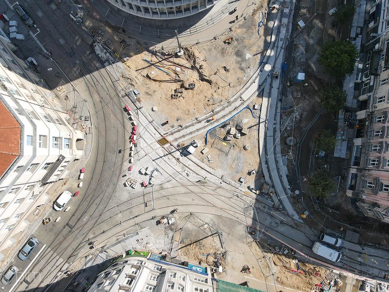 Patrząc na aktualne zaawansowanie prac przy Okrąglaku, w oczy rzuca się właśnie brak opisywanej relacji skrętnej. Na zdjęciach (szczególnie tych z drona) dobrze widoczne jest miejsce na nowy łuk oraz wyprowadzenie szyn w tym kierunku. Jak mówi Maja Chłopocka - Nowak, w pierwszym etapie budowy nowego węzła rozjazdowego zajęto się przede wszystkim wykonaniem tej części, która pozwoliła na szybkie przywrócenie ruchu na remontowanych ulicach Fredry i Mielżyńskiego. Oczywiście jest to prawda,