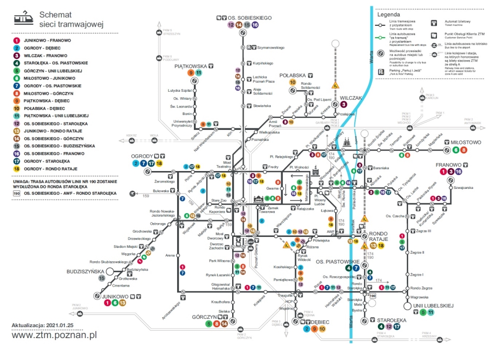Linia nr 190 - od soboty (23 stycznia) ulegnie wydłużeniu i pojedzie z AWF przez most Królowej Jadwigi, rondo Rataje, Zamenhofa, do ronda Starołęka. Przystanek początkowo-końcowy znajdzie się na ulicy Starołęckiej przy sklepie Biedronka na jezdni w kierunku ronda Rataje.