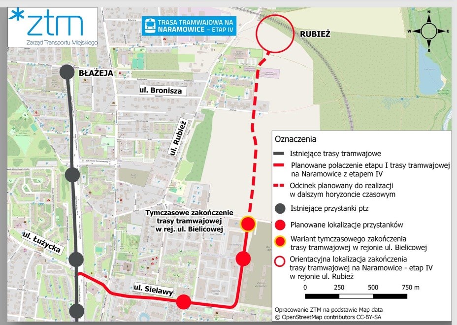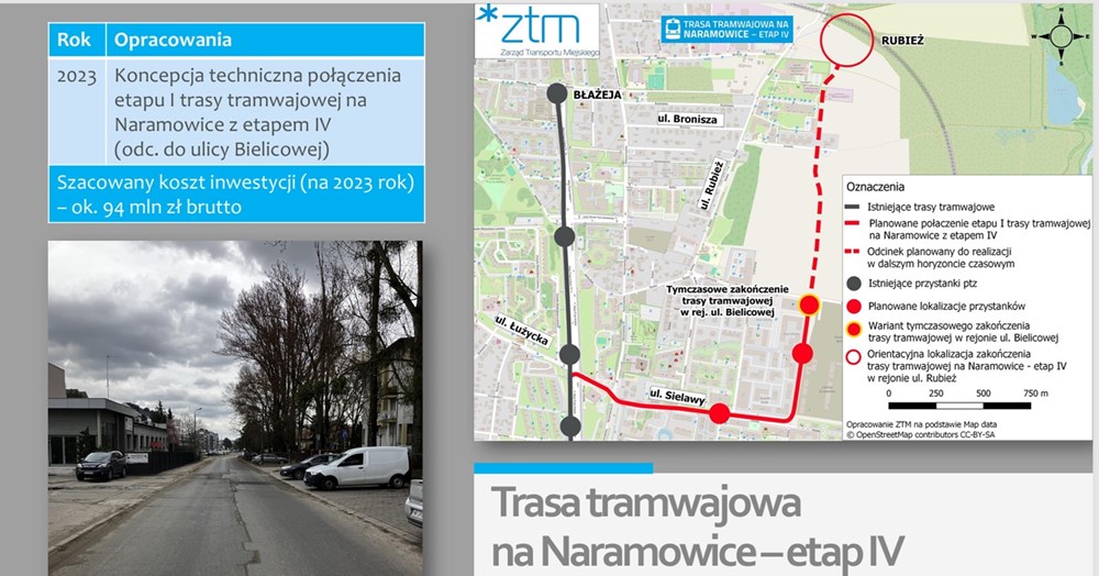 Dyrektor ZTM przekazał także, że w ubiegłym roku miasto odebrało koncepcję połączenia tej odnogi sieci tramwajowej z pierwszym odcinkiem trasy (do Błażeja). Zawiera ona przebieg trasy od rejonu Łużyckiej, przez ulicę Sielawy do wysokości ulicy Bielicowej, gdzie kończy się granica opracowania. Dalszy odcinek, od Bielicowej do umownej Rubieży jak na razie nie ma bardziej szczegółowej koncepcji. Fragment do rejonu Bielicowej został wyceniony na około 94 mln złotych brutto.