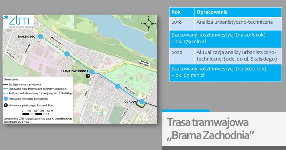 kontekście budowy krótkich odcinków dla tramwajów dwukierunkowych jest tzw. Brama Zachodnia. Jak mówił jednak Jan Gosiewski, zdaniem ZTM realizacja tej inwestycji w postaci wydłużenia obecnej trasy na Dąbrowskiego o jeden przystanek, w rejon ulicy Pięknej, nie ma wielkiego sensu, bowiem nie pozwoli na wyprowadzenie z rejonu pętli Ogrody ruchu autobusowego, co jest niezbędne i pożądane.