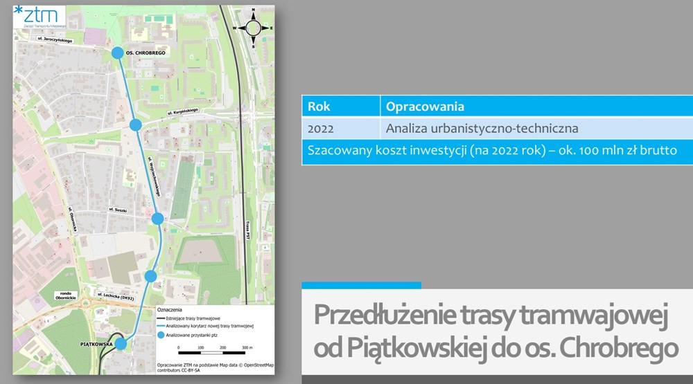 Jan Gosiewski przedstawił również koncepcję wydłużenia linii tramwajowej od obecnej pętli Piątkowska do osiedla Chrobrego, która została wykonana w 2022 roku. Wynika z niej, że nowy odcinek miałby kosztować około 100 mln złotych – To właśnie koszty, ale przede wszystkim jednak bliskość trasy PST sprawiają, że nie jest to zdecydowanie najpilniejsza potrzeba inwestycyjna.
