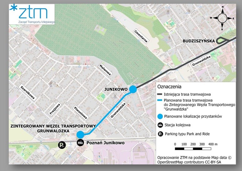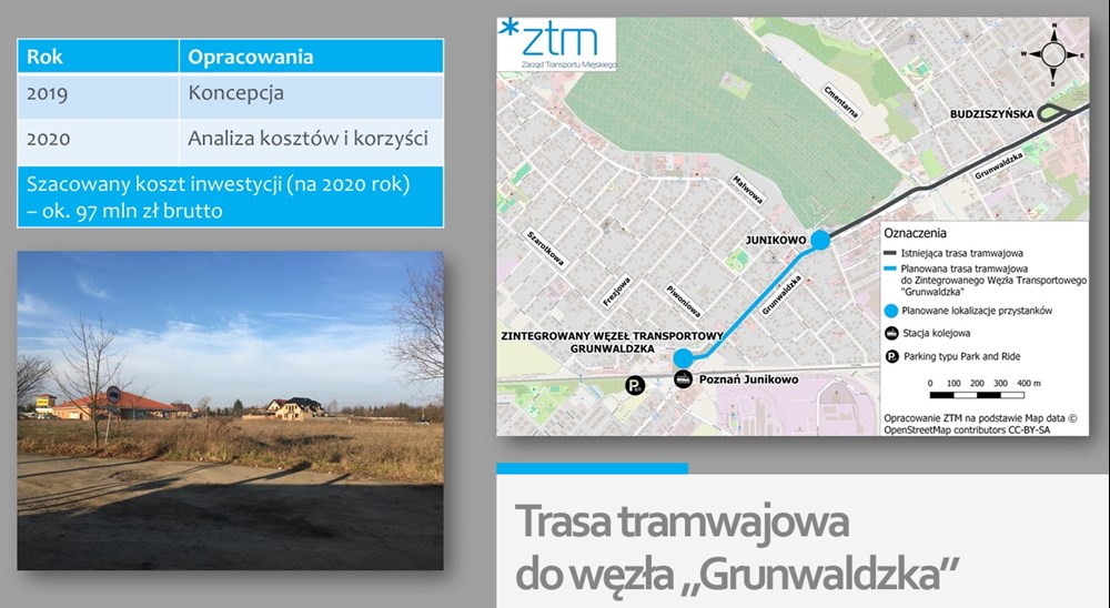 Kolejna trasa to połączenie pętli tramwajowej Junikowo ze stacją kolejową Poznań Junikowo, a więc de facto uzupełnienie “węzła przesiadkowego” Grunwaldzka o największą brakującą część tego zadania, czyli trasę tramwajową. Przypomnijmy, że miasto wraz z samorządem powiatowym i wojewódzkim wykonało bezkolizyjny przejazd pod torami kolejowymi linii Warszawa – Berlin, co usprawniło wjazd do Poznania z jednej z największych wiosek w kraju - Plewisk i tylko zachęciło do wyboru auta kolejnych potencjalnych klientów transportu publicznego, bowiem w tunelu nie znalazło się miejsce dla tramwaju, który wciąż znajduje się prawie kilometr dalej, na pętli Junikowo.