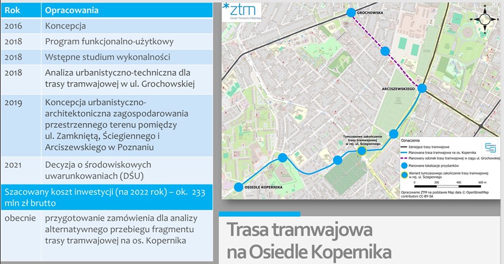 Kolejną trasą omawianą przez dyrektora był odcinek na osiedle Kopernika. Jest to linia, która jest praktycznie gotowa do realizacji w systemie zaprojektuj i wybuduj, ma bowiem PFU oraz ważną decyzję środowiskową wydaną w 2021 roku. Jak mówił nam