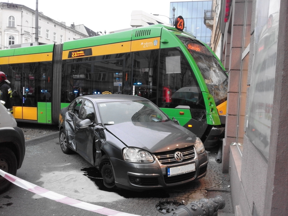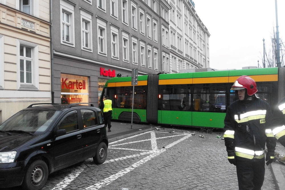 Do groźnego wypadku tramwajowego doszło chwilę po godzinie 11 w Poznaniu. Solaris Tramino na linii 23 wypadł z łuku na wyjeździe z ul. Podgórnej w al. Marcinkowskiego. Pojazd staranował samochody i wbił się w witrynę sklepu meblarskiego znajdującego się w kamienicy.