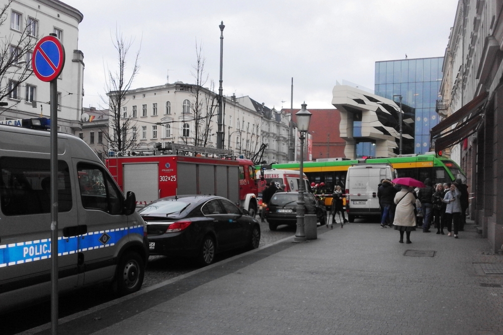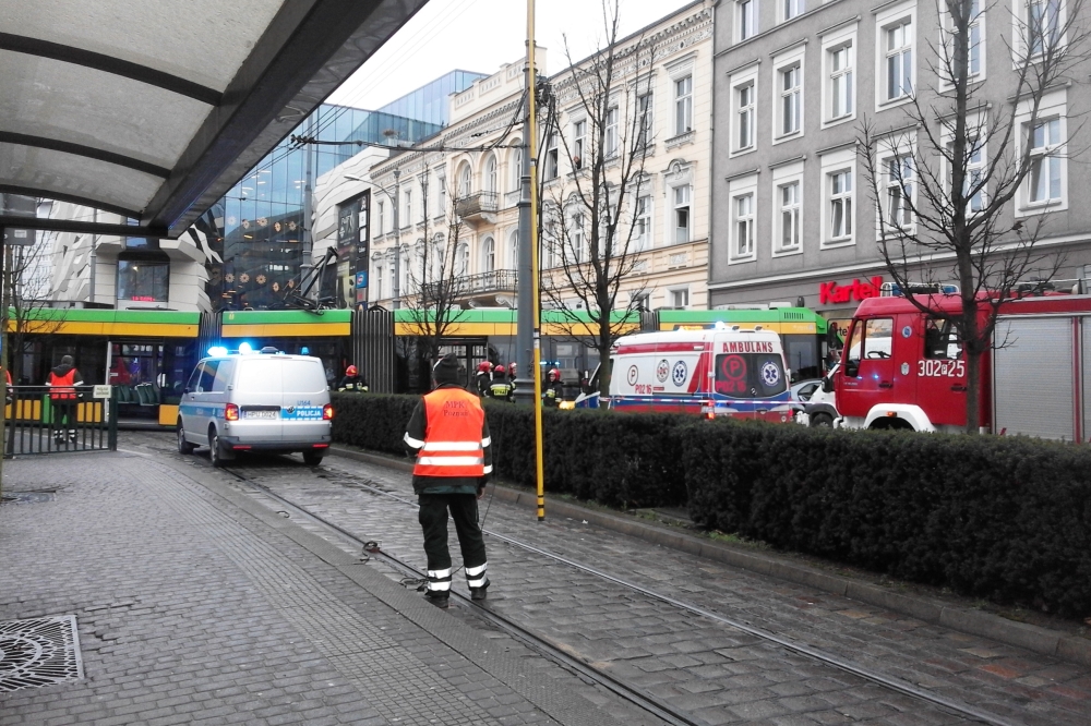 Tramwaj wyjeżdżający z ul. Podgórnej w al. Marcinkowskiego wyskoczył na łuku z szyn i uderzył w kamienicę. Służby ratunkowe i techniczne pracują nad usunięciem pojazdu i przywróceniem ruchu tramwajowego. Poszkodowanym jest motorniczy.