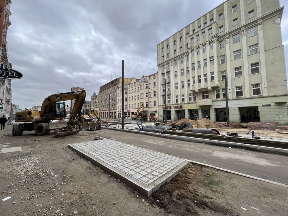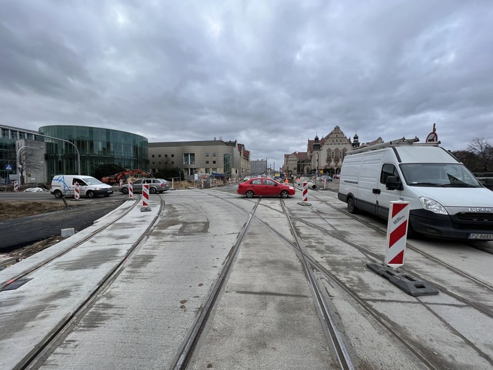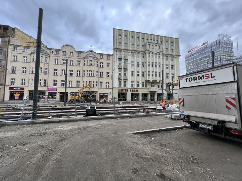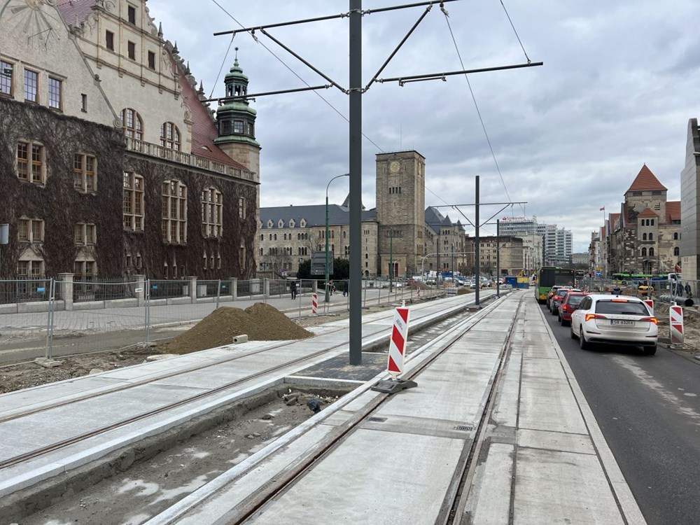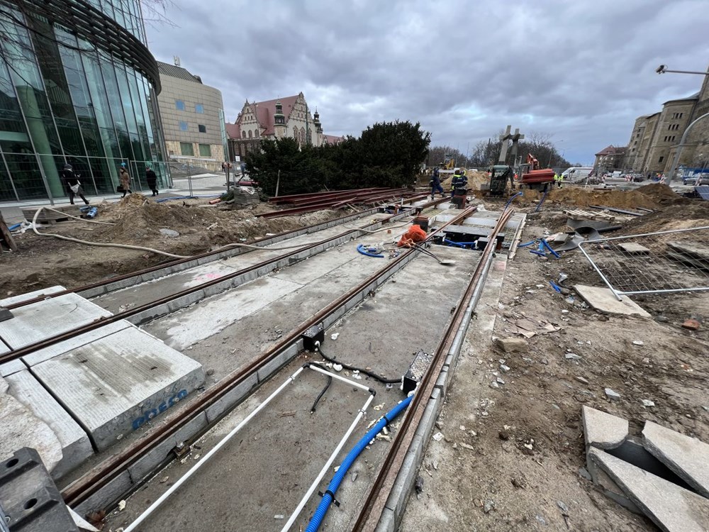 Chłopocka dodała też, że zabetonowano już torowisko na ulicy Towarowej , a w najbliższym czasie wykonawca ma skupić się na budowie odwodnienia torowiska na ul. Towarowej, wykonaniu warstwy podbudowy i układanie kostki granitowej w międzytorzu na ul. Św. Marcin na wysokości ul. Wieniawskiego, a także na pracach przy fundamentach słupów trakcyjnych na Towarowej.