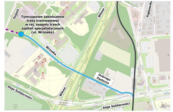 Dalej tramwaje pojadą w śladzie obecnej ulicy Dobrego Pasterza, przekroczą ulicę Witosa nowym wiaduktem (również pieszo-rowerowym) i dojadą na wysokość wejścia do Wielkopolskiego Centrum Pediatrii, gdzie zaplanowano 45-metrowy przystanek, jak na razie pełniący funkcję początkowego i końcowego.