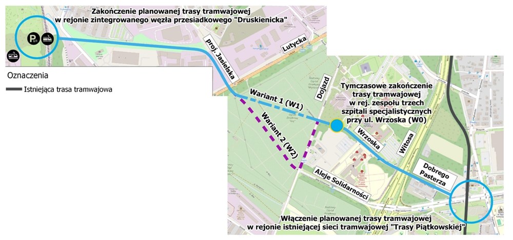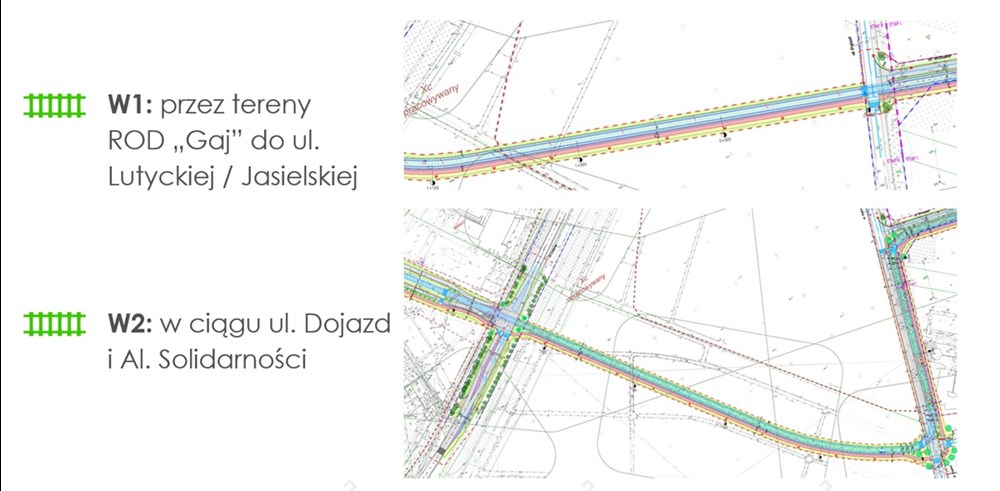 Przygotowywana przez ZTM koncepcja ma dwa warianty dalszego trasowania za szpitalami. Wariant pierwszy (W1) dotyczy budowy nowego odcinka niemalże na wprost od Wrzoska, do Lutyckiej przez teren ogródków działkowych, z kolei drugi (W2) dotyczy okrężnej trasy w śladzie ulicy Dojazd i rezerwy na Aleję Solidarności, również przez ogródki działkowe.