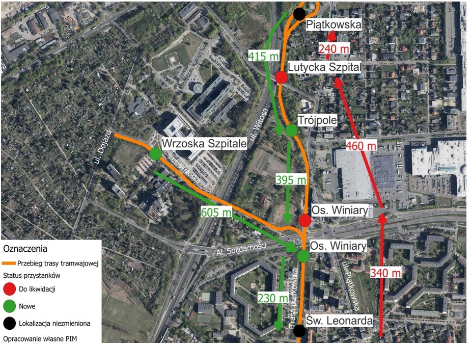 Będą nowe przystanki, stare do likwidacji. Zmiany też w liniach autobusowych i tramwajowychBudowa trasy do szpitali pociągnie też za sobą konieczność zmian w obecnych przystankach tramwajowych w tym rejonie miasta. ZTM pokazał to na specjalnym slajdzie, który prezentujemy poniżej. Widać na nim, że bez zmian, w tym samym miejscu pozostanie - niestety, pętla Piątkowska, która wraz z rozbudową zabudowy wielorodzinnej na północ od pętli coraz bardziej oddala się od pasażerów i staje się dla nich nieatrakcyjna. ZTM nie planuje również przesuwać czy likwidować przystanku Św. Leonarda.