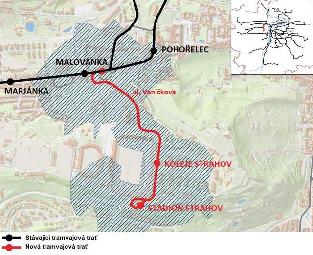 Nowa 1,3-kilometrowa trasa tramwajowa Malovanka – Strahov połączy ul. Bělohorską, wzdłuż Vaníčkovej, z akademikami i istniejącą pętlą autobusową w rejonie skrzyżowania z ul. Turistickiej. W ramach inwestycji zostanie przebudowana ul. Vaníčkova. Na trasie znajdą się dwa nowe przystanki – Koleje Strahov i Stadion Strahov.
