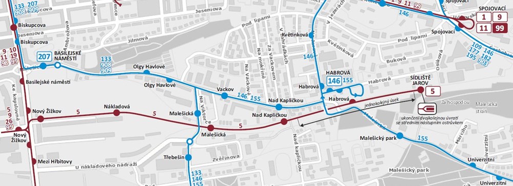 Olšanská – Habrová, która połączy Žižkov z granicą Jarova i Malešic. Linia będzie wykorzystywać korytarz nieczynnej linii Praga-Žižkov – Praga-Malešice oraz przebiegać przez teren byłej stacji towarowej Žižkov, która w najbliższych latach ma się zamienić w nową dzielnicę mieszkaniową. DPP planuje wykorzystać częściowo istniejącą infrastrukturę kolejową.