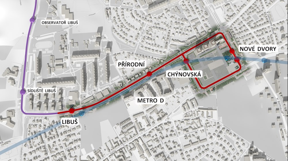 wydłużona o kolejne 1,8 km do planowanej pętli Nové Dvory. Torowisko będzie prowadzić wzdłuż Novodvorskiej z jednotorową pętlą uliczną prowadzącą przez ulice Novodvorską, Durychovą, Libušską and Chýnovską (z torem odstawczym na ul. Novodvorskiej). W sumie powstaną trzy przystanki.