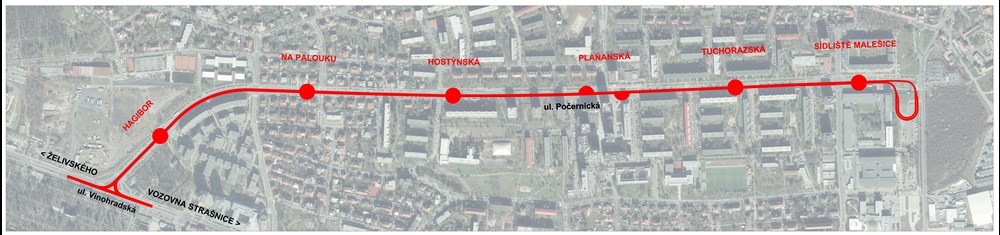 Nowe torowisko będzie przebiegać w pasie dzielącym ul. Počernickiej – od Vinohradskiej do pętli przy Dřevčickiej. Zaplanowano sześć par przystanków, z czego trzy będą obsługiwać także autobusy. Przewidziano zieloną zabudowę torowiska.