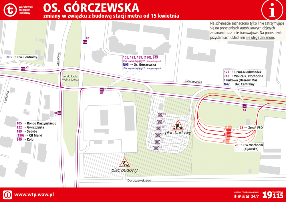 Odjeżdżać stąd będą autobusy linii 105, 122, 189, 190, 249 i N95. Będzie to tzw. postój techniczny, czyli bez możliwości wysiadania i wsiadania. Pasażerowie tych linii będą musieli opuścić autobusy na przystanku Os. Górczewska 03 – na ulicy Górczewskiej, przy stacji paliw. Wsiąść natomiast będą mogli na przystanku Os. Górczewska 01, na ulicy Lazurowej – tuż za skrzyżowaniem z Górczewską (poza linią nocną N95).