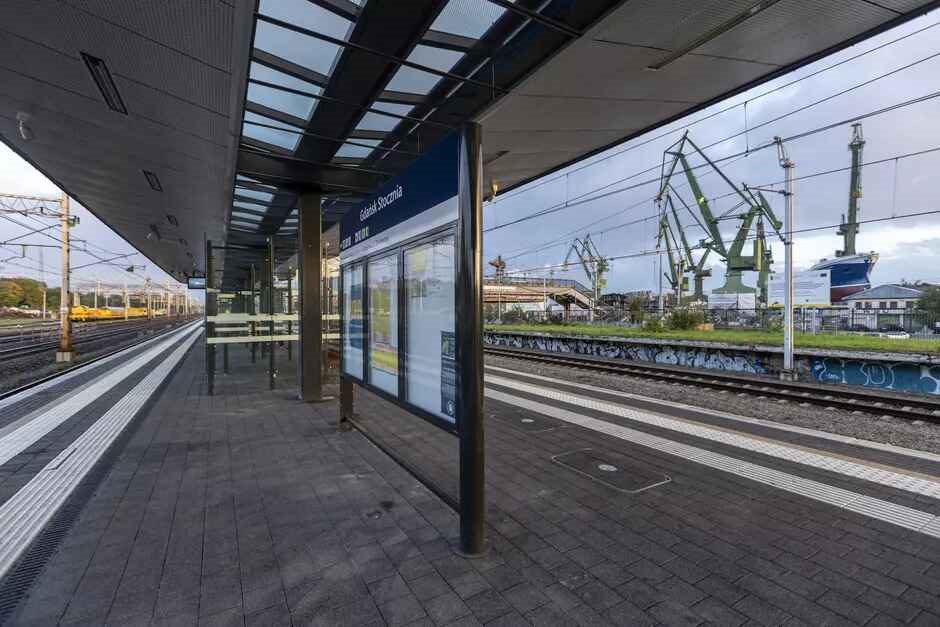 Nietypowo, bo aż dwie wiaty ma wyremontowany przystanek Szybkiej Kolei Miejskiej, z którego dostać można się na tereny stoczniowe. Uwagę zwraca też oryginalna, przeszklona winda, która ozdobiona jest, wykonanym z blachy kortenowskiej, dźwigiem stoczniowym. Prace modernizacyjne już się zakończyły, obecnie trwa procedura odbiorowa odnowionego peronu.