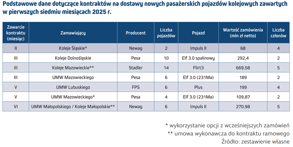 Po bezprecedensowych 13 mld zł wartości kontraktów w całym 2024 r. pierwsze miesiące 2025 r. pokazały powrót do bardziej typowych dla krajowego rynku poziomów inwestycji w tabor kolejowy. W okresie styczeń-lipiec bieżącego roku podpisano umowy na dostawy łącznie 48 pojazdów szynowych, z czego 28 to elektryczne zespoły trakcyjne, a 20 kolejnych to spalinowe zespoły trakcyjne. Kontakty dotyczą wyłącznie taboru regionalnego: 4- i 5-członowych EZT oraz 2-członowych SZT.
