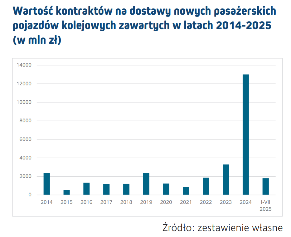 Pierwsze siedem miesięcy 2025 r. przyniosło wyraźne spowolnienie na krajowym rynku zakupów pasażerskiego taboru kolejowego w porównaniu do rekordowego 2024 r. Wartość wszystkich kontraktów na dostawy nowego kolejowego taboru pasażerskiego osiągnęła poziom 1,8 mld zł, co stanowi i tak większą sumę niż w całym 2020 i 2021 r. Rynek pozostaje aktywny dzięki realizacji długoterminowych strategii przewoźników oraz wsparciu ze środków unijnych.