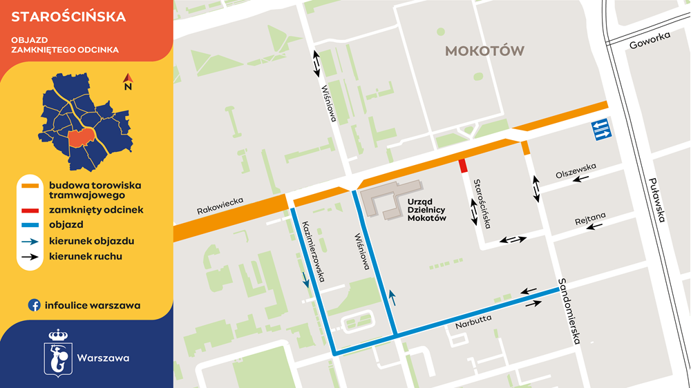 Tego samego dnia, czyli we wtorek, 29 kwietnia, ale o godzinie 6:00 tramwajarze zamkną Starościńską u zbiegu z Rakowiecką. Wprowadzą tam ruch dwukierunkowy. Także na ulicy Rejtana – od Starościńskiej do Sandomierskiej kierowcy pojadą w obie strony. Na Rejtana i Starościńskiej staną zakazy parkowania. Przejazd z Narbutta do Rakowieckiej będzie, tak jak dotychczas, ulicą Wiśniową. Powrót natomiast – ulicą Kazimierzowską. Przebudowa skrzyżowania Starościńskiej i Rakowieckiej potrwa kilka tygodni.