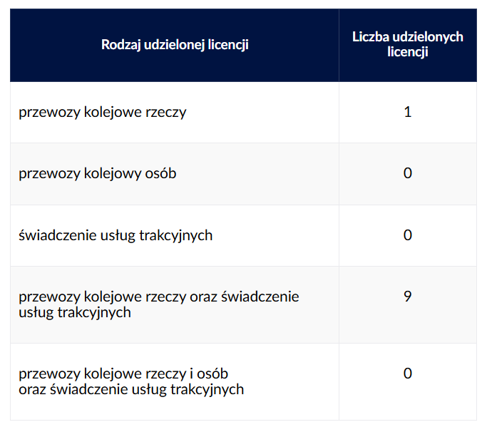 Na koniec 2025 r. liczba licencjonowanych przewoźników kolejowych, którzy posiadali aktywną licencję, wynosiła 147 (wiodąca licencja na przewóz osób – 18, wiodąca licencja na przewóz rzeczy – 129). Natomiast na koniec 2024 r. przewoźników posiadających aktywną licencję było 145 (wiodąca licencja na przewóz osób – 19, wiodąca licencja na przewóz rzeczy – 126).