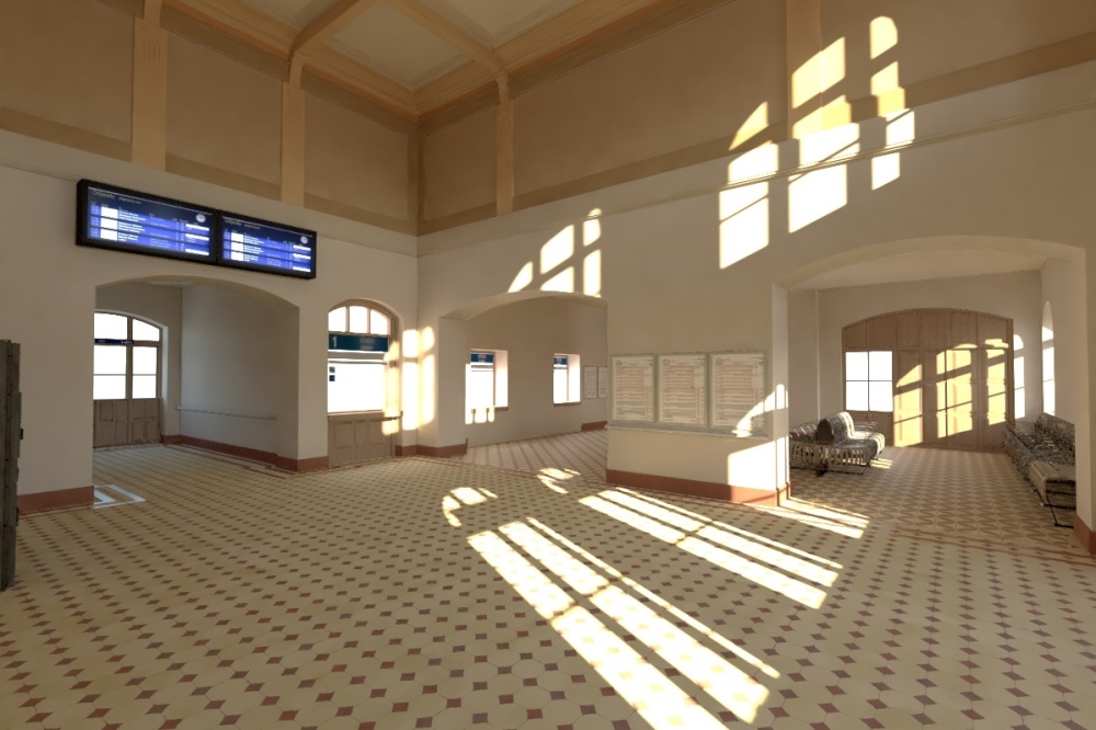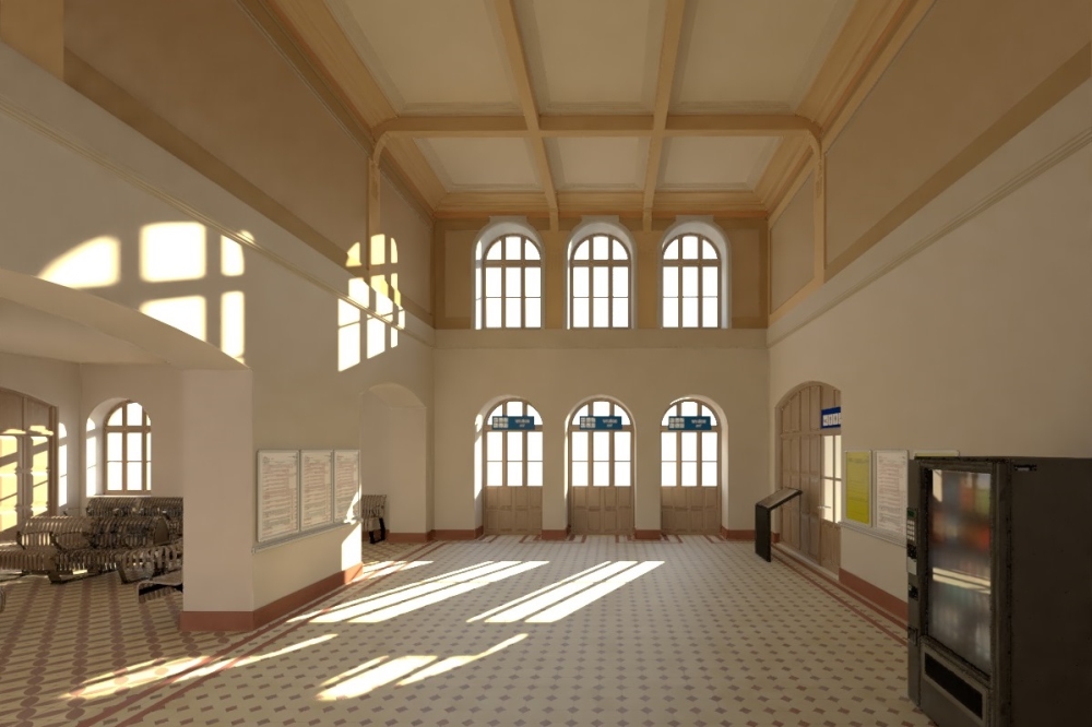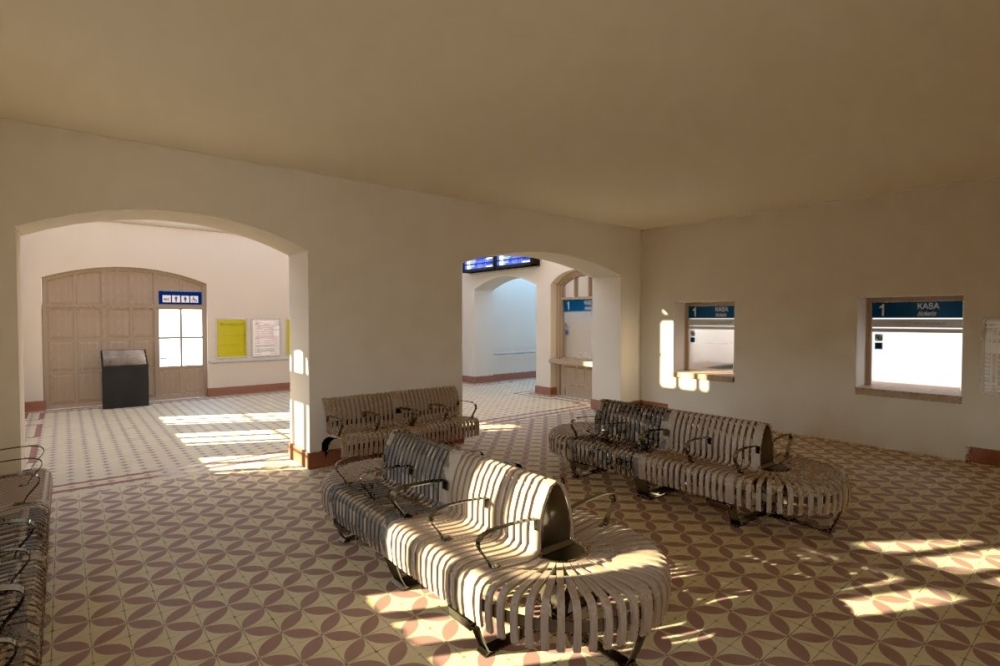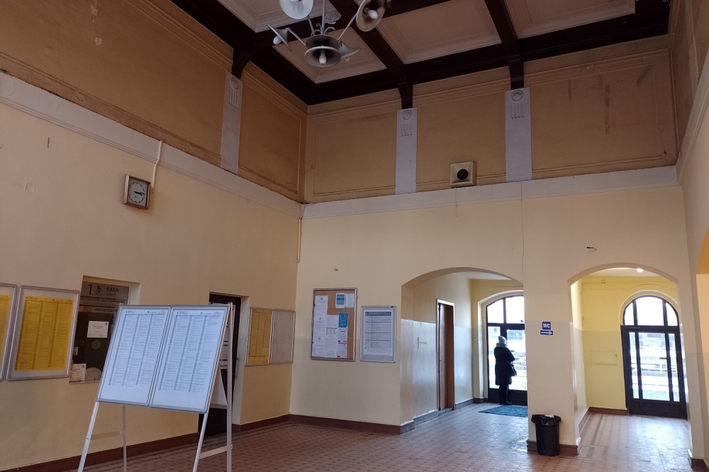Miejsce obsługi podróżnych zlokalizowane będzie w holu pełniącym jednocześnie funkcję poczekalni o powierzchni przeszło 150 m kw. Będzie to komfortowa, klimatyzowana przestrzeń łącząca historyczny wystrój z nowoczesnymi elementami wyposażenia. Renowacji zostaną poddane także zabytkowa, terakotowa posadzka oraz strop kasetonowo-belkowy. Nowymi elementami wystroju wnętrza będą elektroniczne tablice przyjazdów i odjazdów pociągów, gabloty na rozkłady jazdy, a także ławki wyposażone w ładowarki do urządzeń mobilnych. W pobliżu holu zaprojektowano pomieszczenia kas biletowych, toalety oraz niewielki lokal dla najemców komercyjnych. Znaczną część przestrzeni w budynku wynajął samorząd lokalny. Na dworcu, po przebudowie, otworzy on Ośrodek Pomocy Społecznej oraz Muzeum, którego główną salą wystawienniczą będzie historyczna sala restauracji z interesującym stropem kasetonowo-kolebkowym.