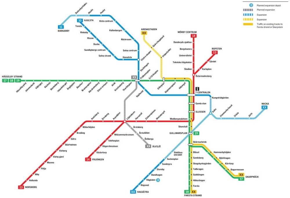 Elektryfikacja obejmie rozbudowywany odcinek żółtej linii metra, od Odenplanu do Arenastaden oraz niebieskiej linii metra do Barkarby na północnym zachodzie oraz do Nacka i Söderord na południowym wschodzie. Ponadto, niebieska linia zostanie połączona z zieloną, a nowy odcinek zostanie wybudowany między Fridhemsplan a Älvsjö. Prace w ramach projektu już się rozpoczęły i potrwają kilka lat. Dostawa będzie realizowana etapami w okresie budowy.