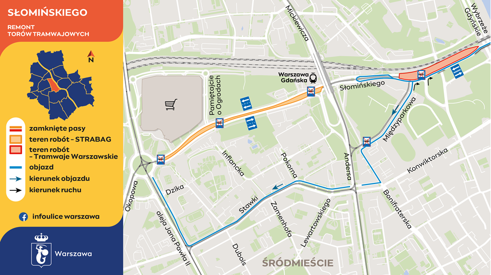 W niedzielę, 3 sierpnia, tramwajarze otworzą jezdnię ulicy Słomińskiego w stronę mostu Gdańskiego, a z robotami przeniosą się na drugą nitkę. Kierowcy nadal będą jeździli jedną jezdnią w obu kierunkach. Wróci za to skręt w prawo w ulicę Międzyparkową i Szymanowską. Dzień później zostanie zamknięta zawrotka przy Dworcu Gdańskim. Żeby dojechać do ulicy Andersa, jadący z mostu Gdańskiego zawrócą na drugą nitkę Słomińskiego przed wiaduktem i dalej pojadą Międzyparkową.