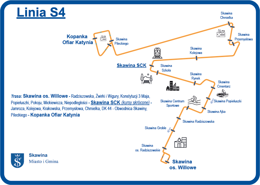 Trasa nowej linii S4: Skawina os. Willowe – Radziszowska, Żwirki i Wigury, Konstytucji 3 Maja, Popiełuszki, Pokoju, Mickiewicza, Niepodległości – Skawina SCK (kursy skrócone) – Jamroza, Kolejowa, Krakowska, Przemysłowa, Chmielka, DK 44 – Obwodnica Skawiny, Pileckiego – Kopanka Ofiar Katynia