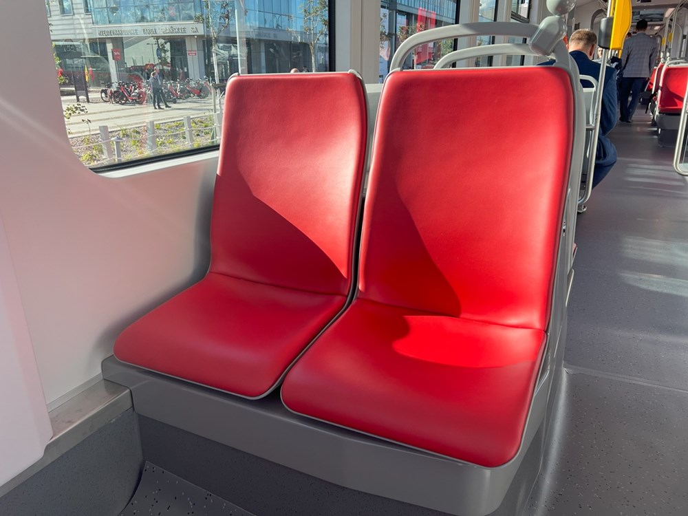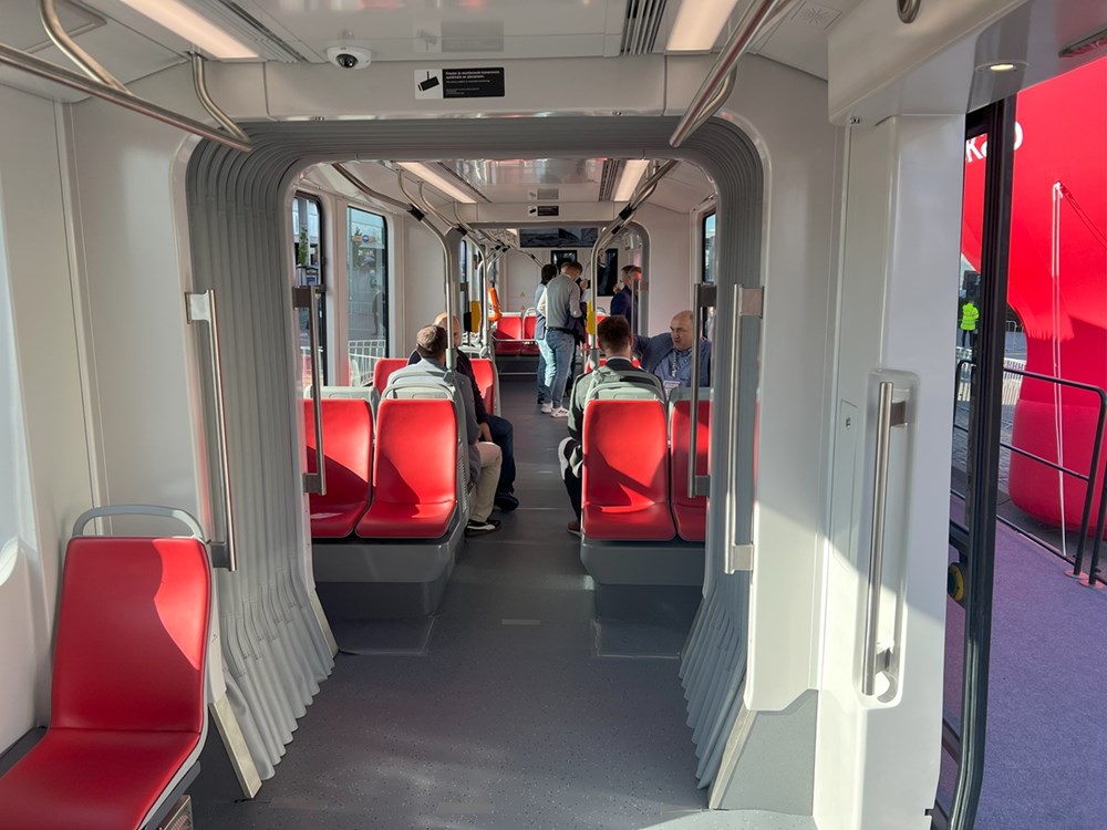 Skoda zastosowała w nim kolorystykę znaną z innych pojazdów DPP Praga, mamy więc krwistoczerwoną tapicerkę siedzeń i jasne ściany. Trzeba przyznać, że siedzenia są wygodne i dobrze wyprofilowane. Naszą uwagę przykuła ogromna tylna szyba tramwaju, również dodająca tramwajowi przestronności.