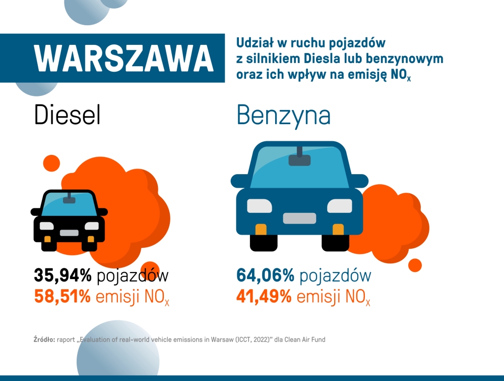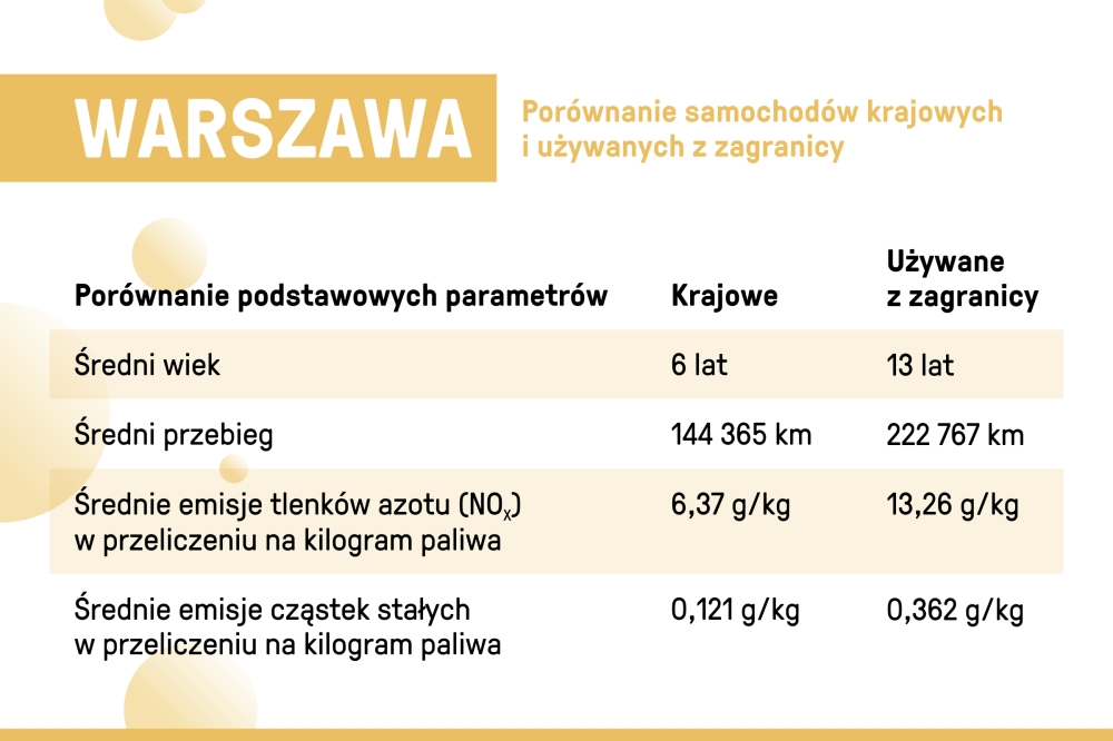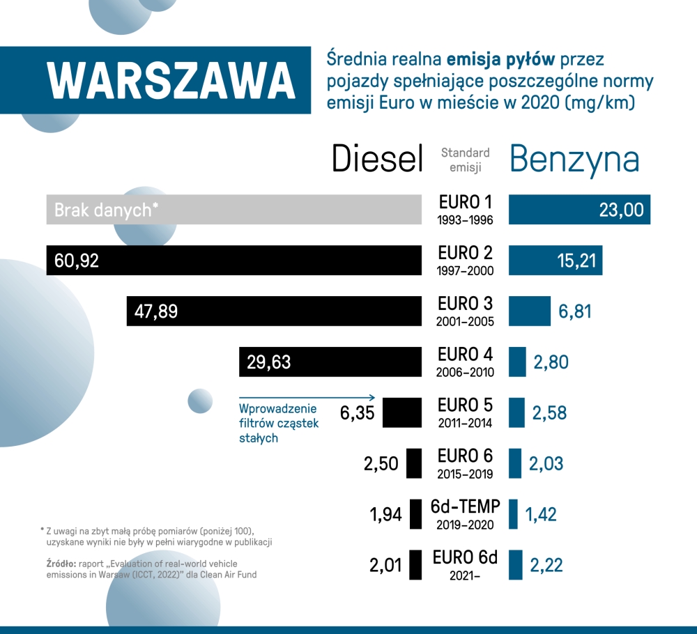 Z raportu wynika, że 17 proc. samochodów osobowych poruszających się po Warszawie wyprodukowano przed 2006 r. To właśnie ta najstarsza grupa aut emituje najwięcej zanieczyszczeń – 37 proc. emisji tlenków azotu (NOx) oraz 52 proc. pyłów (PM). Pomiary wskazują, że emisje szkodliwych gazów wzrastają nawet kilkukrotnie wraz z wiekiem pojazdów.