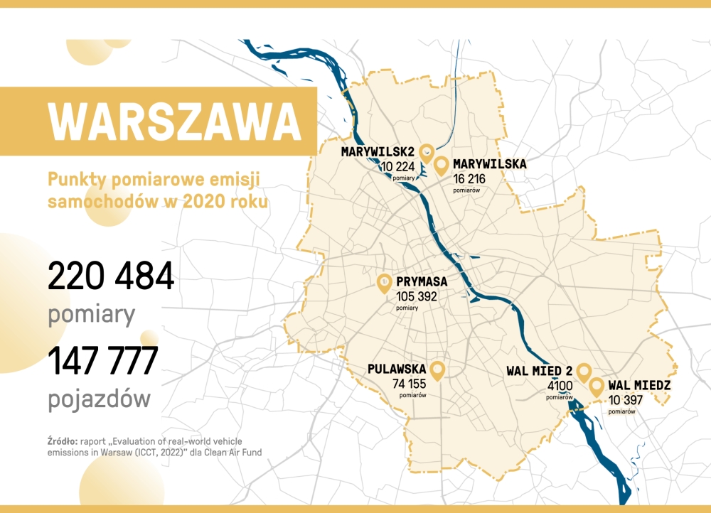 Wyniki badańBadanie w tym zakresie zrealizowała Międzynarodowa Rada Czystego Transportu (International Council on Clean Transportation) na zlecenie TRUE Initiative przy współpracy z Urzędem m.st. Warszawy. W sześciu warszawskich lokalizacjach na przełomie września i października 2020 r. dokonano 220 tys. pomiarów metodą TRUE (The Real-World Urban Emissions) na niemal 150 tys. pojazdach różnego typu.
