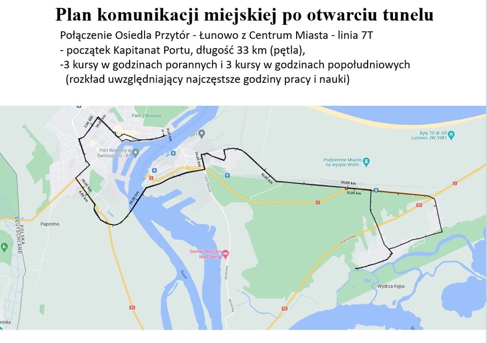 Linia 7T (tunelowa) pojedzie z osiedla Przytór-Łunowo bezpośrednio na wyspę Uznam – przez tunel do Kapitanatu Portu. W tym przypadku również zaplanowano trzy kursy w godzinach porannych i trzy w godzinach popołudniowych. Nie zmieni się natomiast trasa linii 7 z pętli przy ul. Zalewowej do dworca PKP, gdzie będzie można skorzystać z innych środków lokomocji.