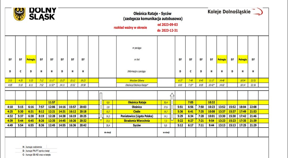 Jeśli podróżni z Sycowa będą chcieli dotrzeć aż do Wrocławia, to najszybszy pociągo-autobus ma ich tam dowieźć w czasie godziny i 25 minut. W dni robocze zaplanowano po siedem par kursów do i z Sycowa. Wstępny rozkład znajduje się poniżej.