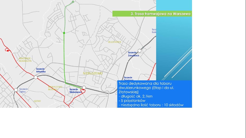 Szczecin dysponuje wstępną koncepcją budowy nowej linii tramwajowej na Warszewo. W jej pierwszym etapie zakłada się budowę 2,1-kilometrowego odcinka torów, od stacji Niebuszewo w rejon ulicy Złotowskiej. Trasa miałaby być obsługiwana taborem dwukierunkowym.