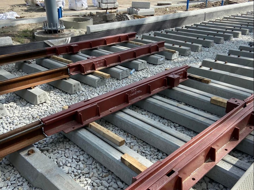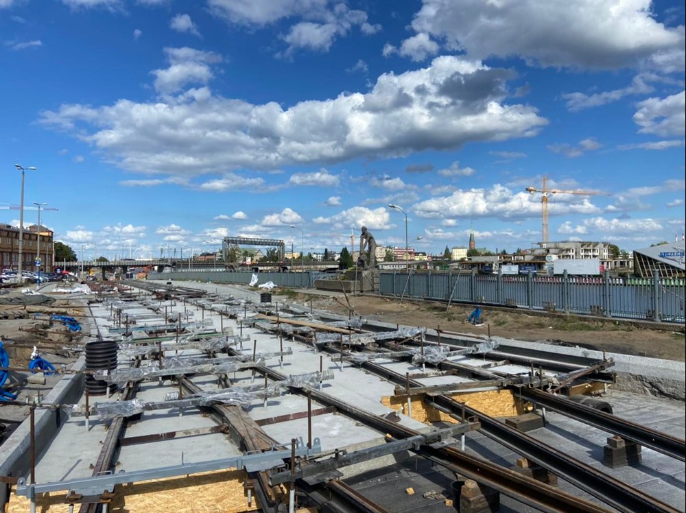 Postęp prac bardzo dobrze widać na najnowszych zdjęciach. Przy dworcu kolejowym montowany jest aktualnie docelowy układ torowiska, ciągle zawierający trzeci tor.