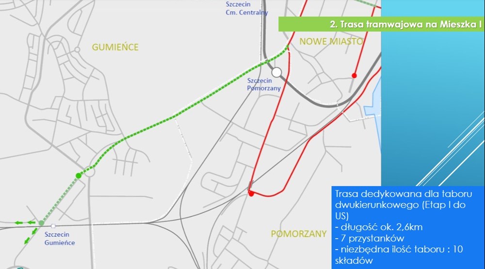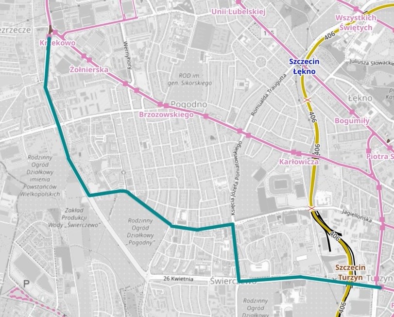 z założeniami z ubiegłego roku, ta trasa miałaby mieć około 2,6 kilometra długości i w pierwszym etapie mogłaby kończyć swój bieg za rondem Uniwersyteckim, natomiast docelowo miałaby kończyć swój bieg przy stacji kolejowej Szczecin Gumieńce. Temat tej trasy wiceprezydent rozwinął nieco bardziej w jednym z wpisów na swoim facebookowym profilu, gdzie przekazał, że ta inwestycja spośród zupełnie nowych odcinków tras jest najmniej zaawansowana dokumentacyjnie i ma najmniejsze prognozowane potoki pasażerskie.
