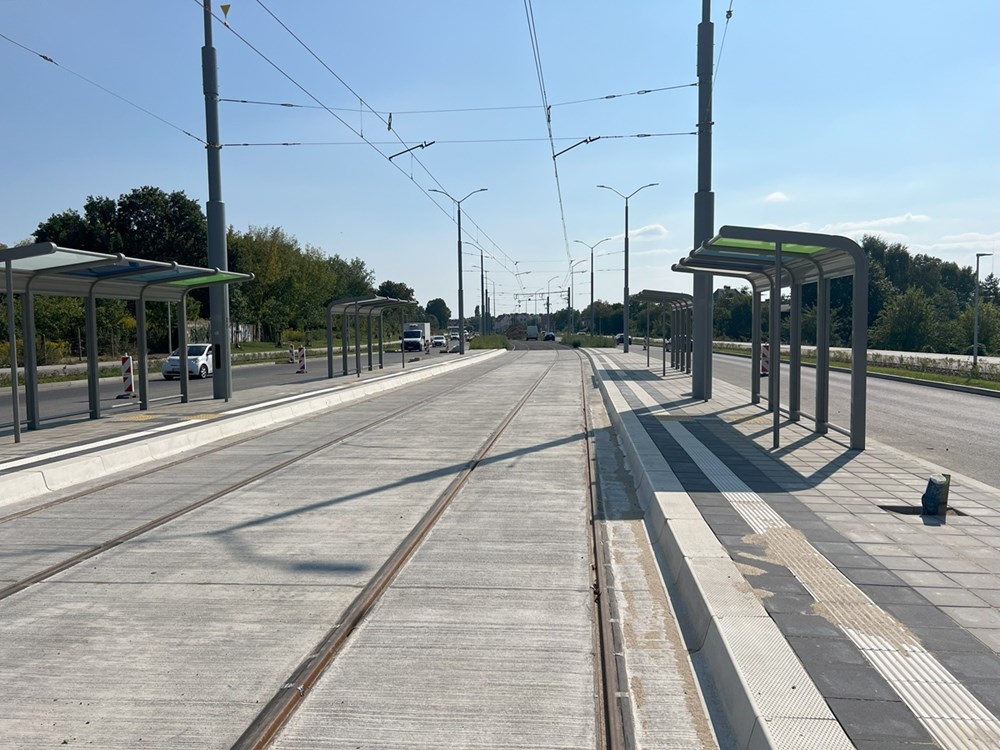Gotowy zespół przystankowy w kierunku Turzyna i centrum miasta. W oddali widoczne ślepo urwane tory