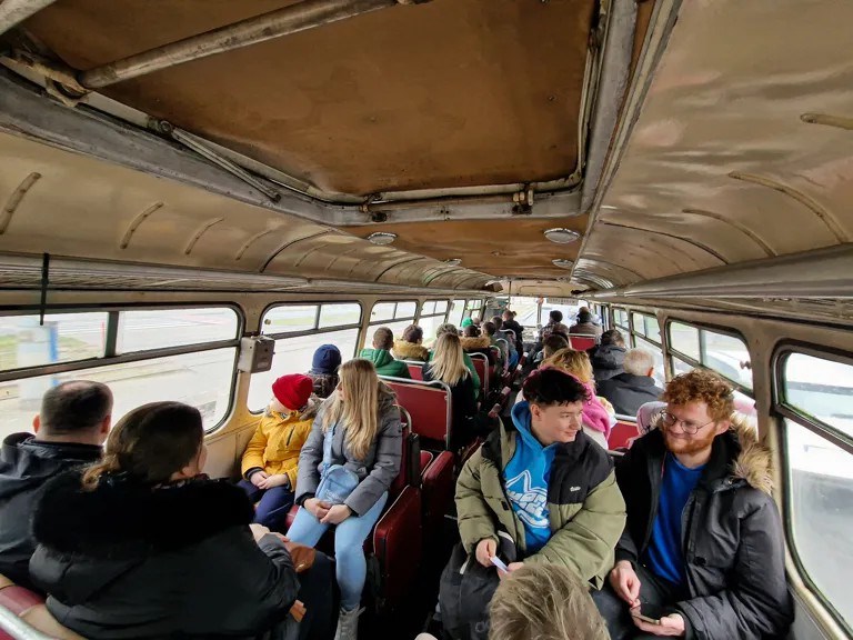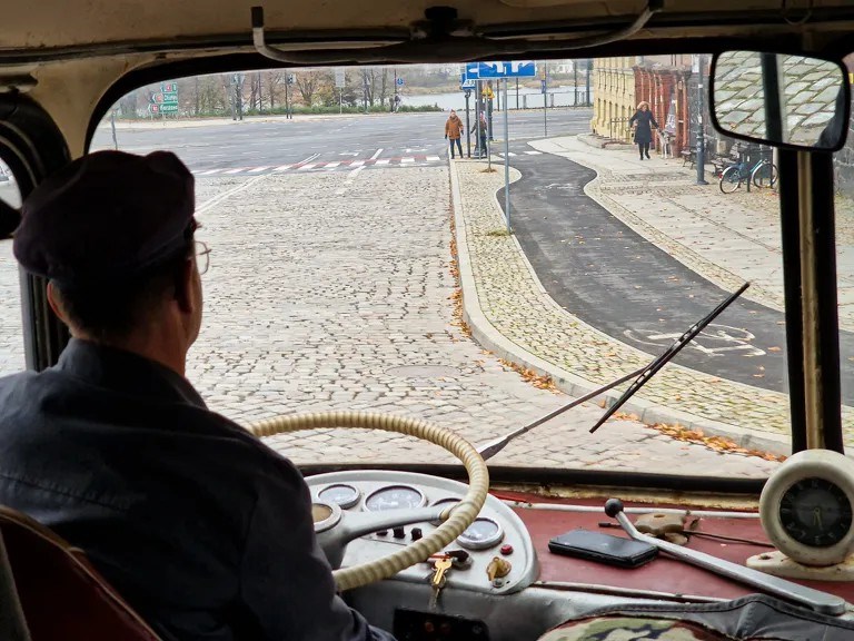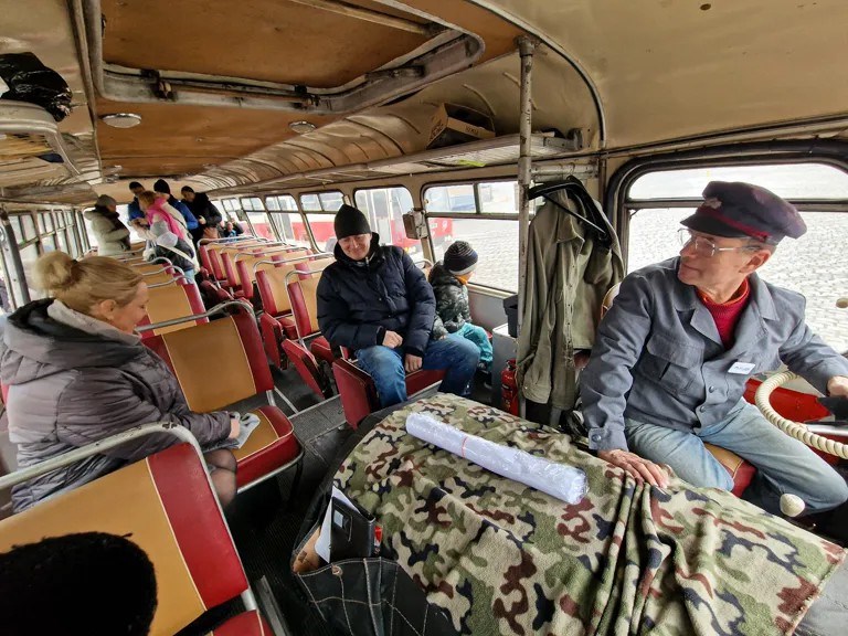 Oskar, mężczyzna słusznego wzrostu, na przejażdżkę do Toruniu przyjechał z Bydgoszczy. – Lubię historię i pasjonuję się motoryzacją, więc jak to się zazębia, korzystam. W Bydgoszczy zawsze uczestniczę w zlotach starych samochodów, byłem na paradzie autobusów, a teraz przyjechałem do was. Było warto, chociaż muszę się schylać, żeby nie zahaczyć głową o dach. Jest ze mną żona i córki i też im się podoba. To już nasz drugi kurs, a jak się uda, zrobimy jeszcze jedno kółeczko – zapowiada mężczyzna.