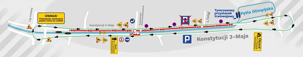 Od 25.08.2025r. zawracanie tramwajów na pętli odbywać się będzie po tzw. trójkącie. Przystanek końcowy zlokalizowany będzie na wysokości przystanku autobusowego, a początkowy na torze wyjazdowym z pętli. Również od 25.08 nie będzie przejazdu przez torowisko tramwajowe na wysokości ul. Kosynierów Kościuszkowskich.