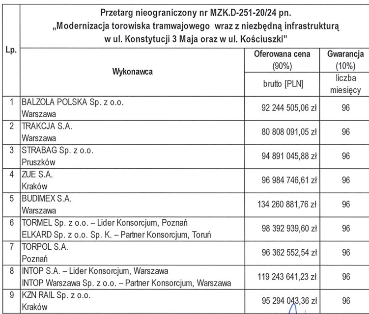 MZK właśnie otworzył złożone oferty. Dowiedzieliśmy się więc, że realizacją prac zainteresowanych jest 9 podmiotów, z ofertami wartymi od 80,808 mln złotych do 134,26 mln złotych brutto. Najtańszą ofertę złożyła Trakcja, natomiast najdroższą Budimex. Pełne zestawienie ofert znajduje się poniżej. Budżet zamawiającego to 86,1 mln złotych brutto, w którym mieści się tylko oferta Trakcji.