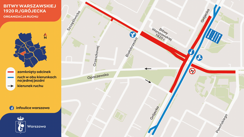 W związku z rozszerzeniem obszaru robót przy układzie torowym i przebudowie ciepłociągu zamknięta zostanie ul. Bitwy Warszawskiej 1920 r. – pomiędzy Białobrzeską a ul. Grójecką. Odcinek ten pozostanie zamknięty do przełomu lipca i sierpnia.