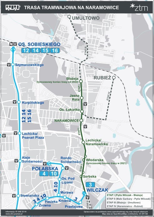 Projekt tramwaju na Naramowice obejmuje także kolejne etapy, a więc co najmniej dwa następne odcinki tras, w kierunku Umultowa oraz Rubieży.