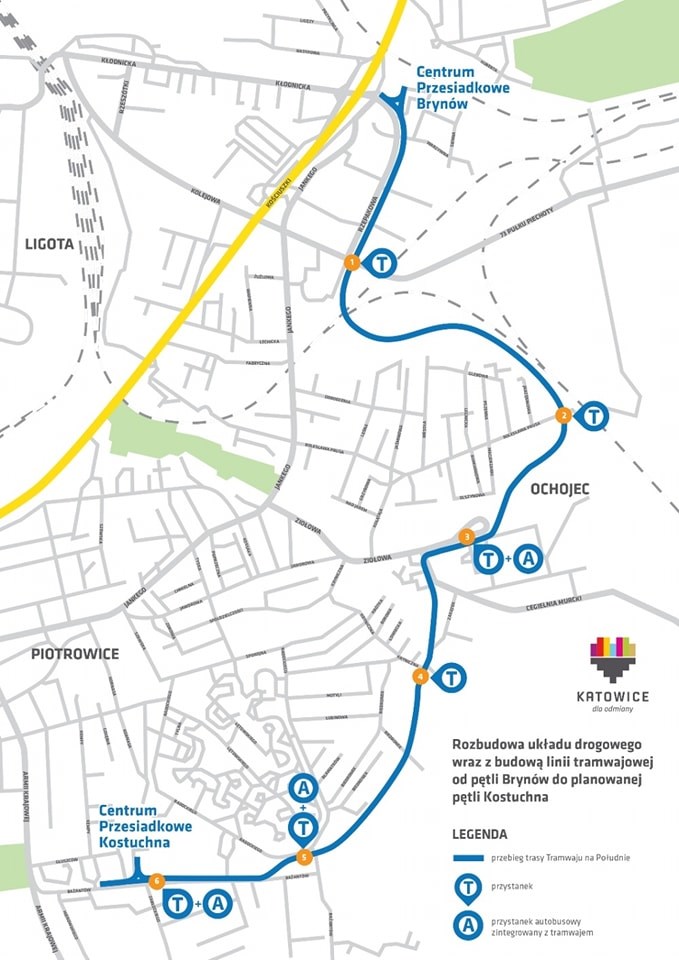5,2-kilometrowa linia tramwajowa na południe Katowic będzie największą inwestycją w obszarze transportu publicznego w najnowszej historii miasta. Trasa rozpocznie swój bieg od uruchomionego w 2020 roku Centrum Przesiadkowego Park & Ride „Brynów", a zakończy się kolejnym Centrum Przesiadkowym Park & Ride „Kostuchna", przy ulicy Bażantów powyżej skrzyżowania z ul. Zabłockiego. W ramach przebiegu nowej linii powstanie sześć przystanków tramwajowych, z których trzy będą także zapewniały możliwość bezpośredniego przesiadania się na autobus w systemie „drzwi – drzwi".