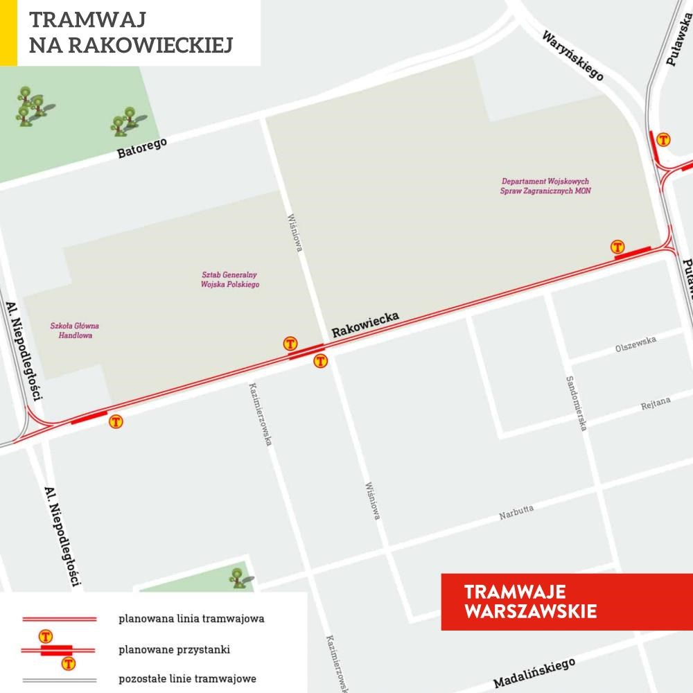 Tramwaje Warszawskie otworzyły oferty w przetargu na budowę torowiska w ul. Rakowieckiej między al. Niepodległości a Puławską w ramach tramwaju do Wilanowa. O zamówienie ubiega się sześć podmiotów, ale żaden nie zmieścił się w budżecie.