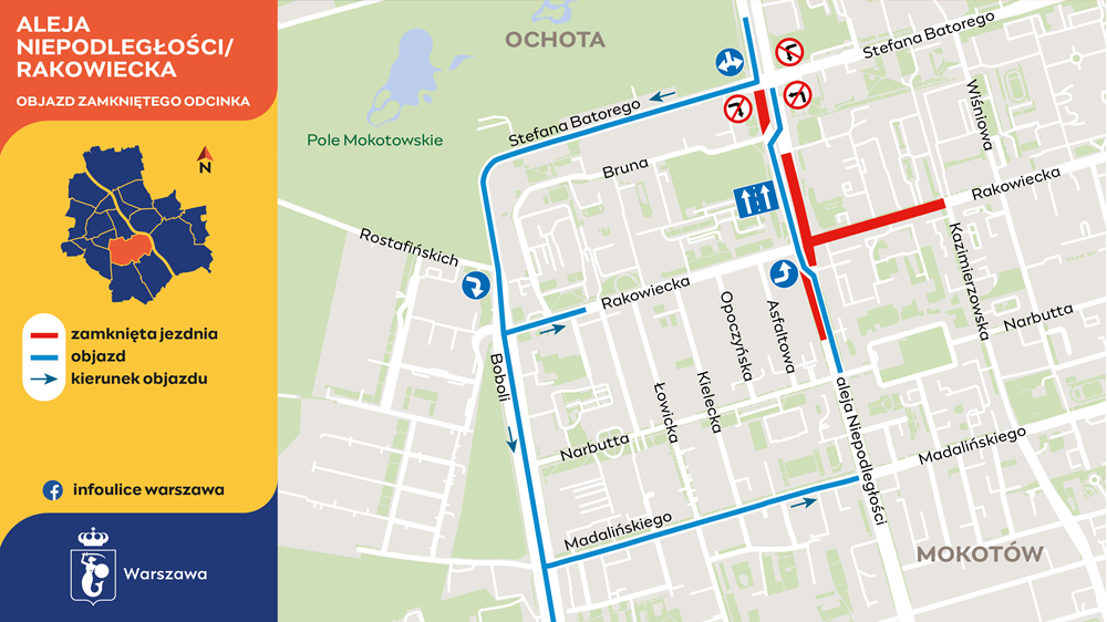 Otwarta zostanie Rakowiecka na odcinku od ul. Opoczyńskiej do al. Niepodległości. Zarówno z ul. Rakowieckiej, jak i z ul. Bruna kierowcy będą mogli skręcić wyłącznie w lewo, w stronę Dw. Centralnego.